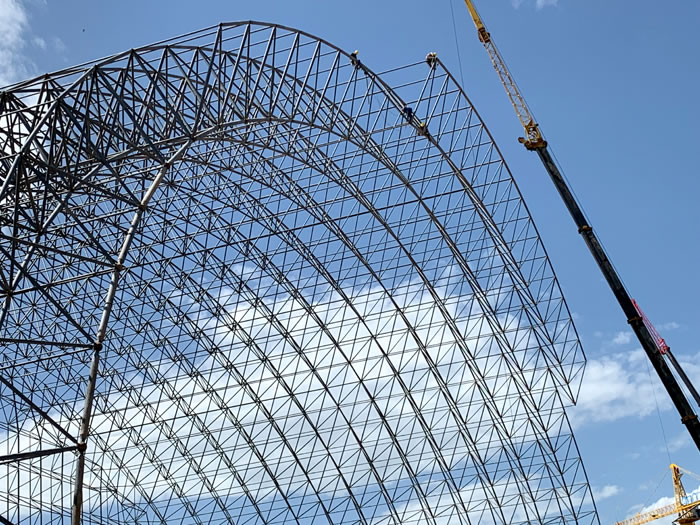 (2)网架加工前应对现场尺寸进行复测,确认无误后方可进行加工、安装;网架制作、运输、安装应遵守《空间网格结构技术规程》JGJ7-2010、《钢网架泊头螺栓球节点》JG/T 10-2009、《钢网架泊头螺栓球节点用高强度螺栓》 GB/T 16939-2016、《泊头钢结构泊头工程泊头施工规范》 GB50755-2012、《泊头钢结构泊头工程泊头施工质量验收标准》 GB50205-2020。